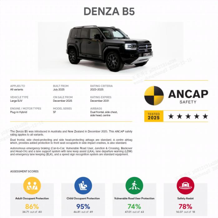 可能很多人对这项测试不是很了解,据悉,这是澳洲新车安全评鉴协会(ANCAP)正式公布的车型安全评级,也是目前全球领先的汽车安全评估机构。在测试中,方程豹豹5在主动和被动安全性能上均表现优异,获得了5星安全评级。其中,成人保护、儿童保护、行人保护、安全辅助等四项核心测试均达到全球领先,尤其是儿童保护测试得分率更是突破95%,成为ANCAP理念测试成绩最好的车型之一。
